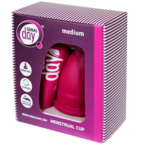 Menštruačný kalíšok Genial Day je vyrobený z lekárskeho TPE (termoplastický elastomér). Tento materiál sa vyrába v Nemecku v súlade s prísnymi normami a požiadavkami pre zdravotnícke pomôcky. Lekárske a medicínske štúdie dokazujú, že elastoméry nie sú toxické, sú hypoalergénne a nedráždia pokožku. Práve preto sú vhodné na výrobu zdravotníckych pomôcok používaných v priamom styku s pokožkou. Menštruačný kalíšok Genial Day vyrobený z takéhoto elastoméru je mäkký, trvanlivý, odolný proti roztrhnutiu a je dobre znášaný v prostredí vaginálnej mikroflóry. Šálka je bez ftalátov (zmäkčovadlá), PVC a latexu.