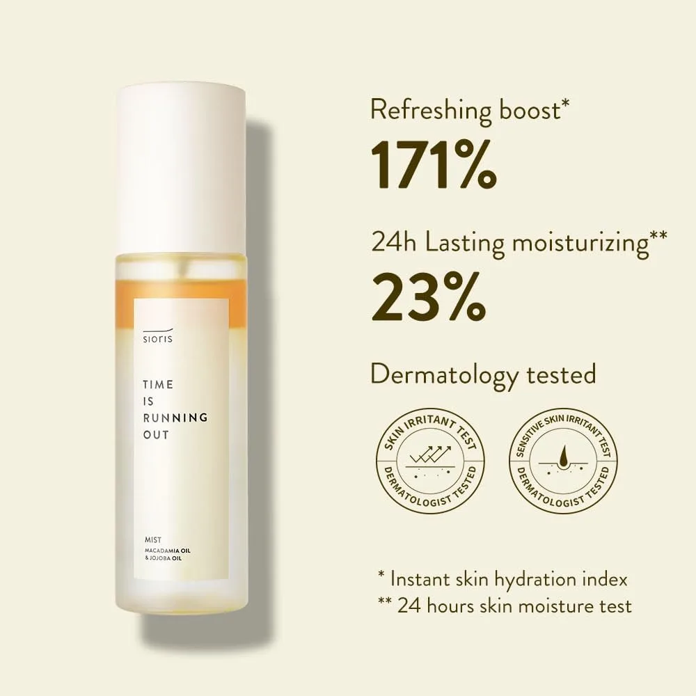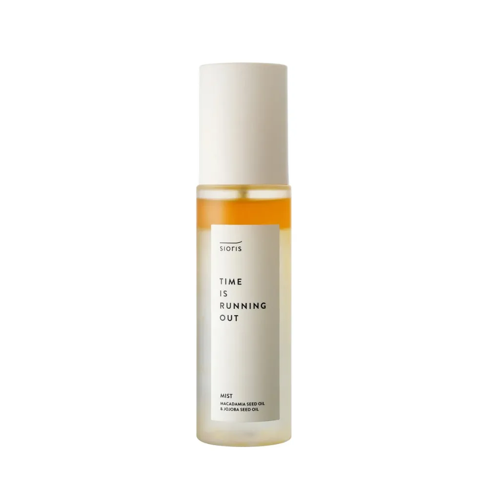 Sioris Time is Running Out Mist je toner typu 3v1 – osviežuje počas dňa ako pleťová hmla, vyživuje ako esencia v rannej i večernej rutine. Vyniká nízkym pH, pleť upokojuje, nedráždi a dodáva pokožke osviežujúcu hydratáciu a výživu. Vyrobený je zo 78% organickej ovocnej vody (yuja), ktorá je nabitá živinami a minerálmi, ktoré poskytujú okamžitú hydratáciu. Tri rastlinné oleje prospievajúce pokožke – makadamiový olej, jojobový olej a slnečnicový olej – poskytujú dlhotrvajúcu výživu a vlhkosť.